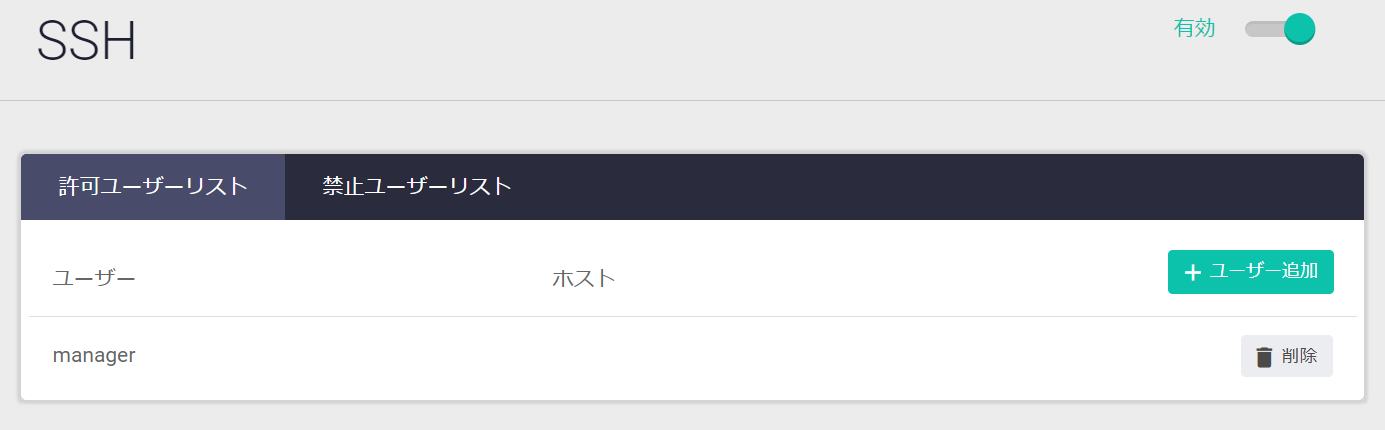 | 許可ユーザーリストタブ | SSHサーバーへのログインを許可するユーザーの一覧・設定をします |