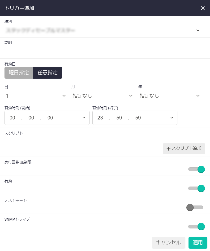 | 有効日 | トリガーを実行する曜日、開始時間、終了時刻を指定します。任意の年月日、開始・終了時刻を指定したい場合は任意指定ボタンをクリックし指定します |