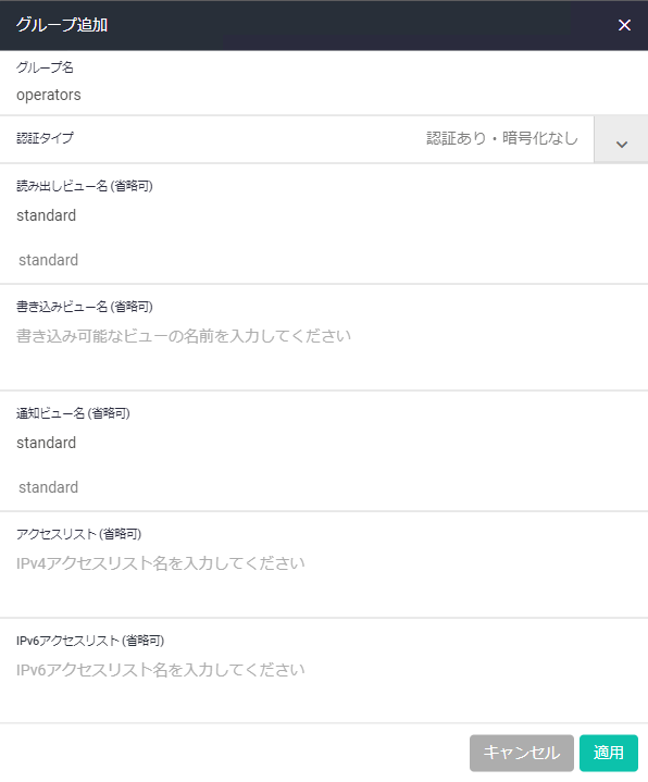 | アクセスリスト (省略可) | 本グループ所属ユーザーでアクセス可能なSNMPステーションをIPv4アドレスで制限したい場合、あらかじめ作成しておいた標準IPアクセスリスト名を入力または選択してください |