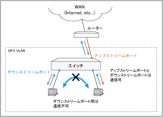 UFO(Upstream Forwarding Only) VLANは、アップストリームポートとダウンストリームポートという2種類のポートで構成される特殊なVLANです。