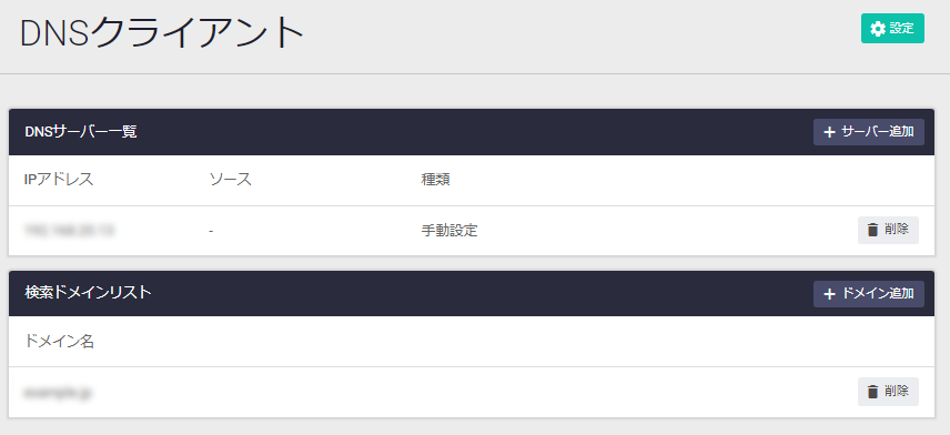 | 削除ボタン | DNSサーバーの登録を削除します。削除前には確認のダイアログが表示されます |