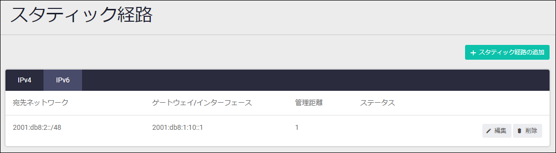 NoteIPv6スタティック経路のゲートウェイ(ネクストホップ)をリンクローカルアドレスで指定する場合はCLIのipv6 routeコマンドをご使用ください。