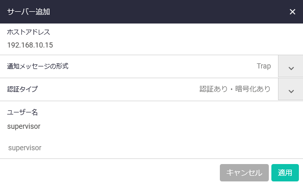 | ユーザー名 | SNMPユーザー名を入力または選択してください |