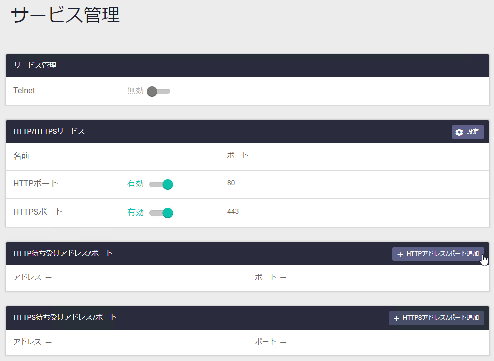 | HTTP、HTTPSのそれぞれについて、全アドレスを対象とした待ち受けポートの有効・無効やポート番号の確認、変更ができます。 ここで設定するのは全アドレスを対象とした待ち受けポート(初期設定ではHTTPが「*:80」、HTTPSが「*:443」)です。 スライドボタンで無効にした場合、全アドレス対象のポートはクローズされますが、HTTP待ち受けアドレス/ポート、HTTPS待ち受けアドレス/ポートによって特定アドレス上でポートをオープンさせることはできます |