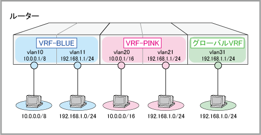 NoteVRFインスタンス間通信を行っているときはVRFインスタンス間で経路情報を送受信するため、各VRFインスタンスの独立性はなくなります。そのため、VRFインスタンス間で重複するIPアドレス空間は使用できません。