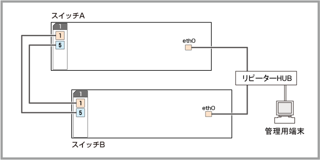 - eth0をレジリエンシーリンクだけでなく、通常のマネージメントポートとしても利用したい場合は、eth0間にリピーターHUBをはさむ必要があります。そのため、UTPケーブルを2本以上必要なだけ用意してください(スタックメンバー2台分+管理端末などの接続用)。なお、スイッチポートをレジリエンシーリンクに設定する場合は、該当スイッチポートはレジリエンシーリンク専用となり、他の用途には使用できません。