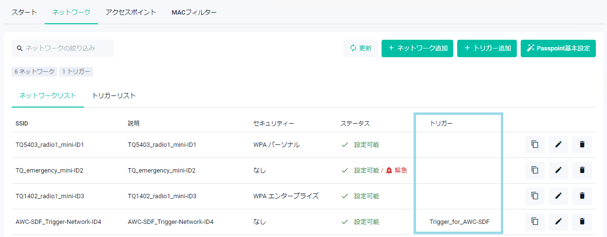 | トリガー | 対象無線ネットワークに関連付ける無線トリガーを指定します。無線トリガーを関連付けた無線ネットワークは、トリガーが有効化されたときだけ有効になります |