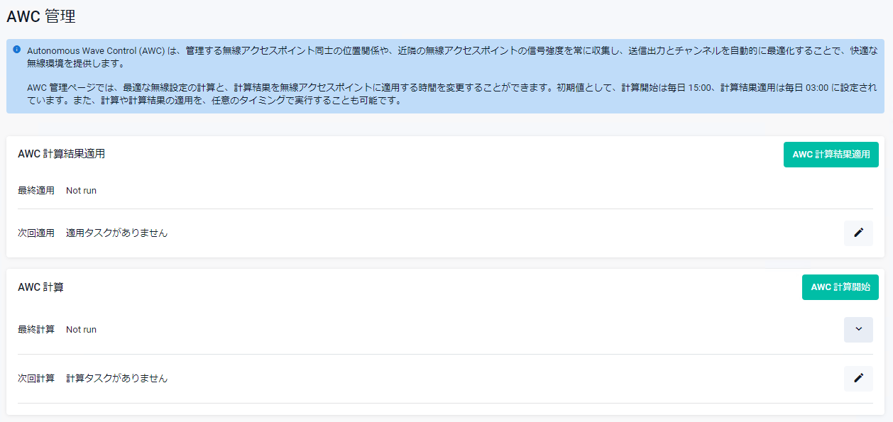 Web GUIによって作成されたAWC計算適用タスク(type power-channel ap)にはタスク番号「1000」が、AWC計算タスク(type power-channel ap)には「1001」が自動的に割り当てられます。これらのタスク設定をCLIから変更しないでください。