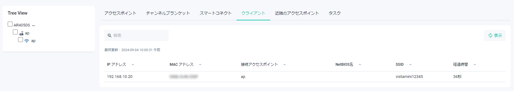 Note無線クライアント情報を表示させるには「表示」ボタンを押してください。なお、本ページで表示される情報は管理下アクセスポイントからクライアント接続情報に更新があるごとに送られてきます。