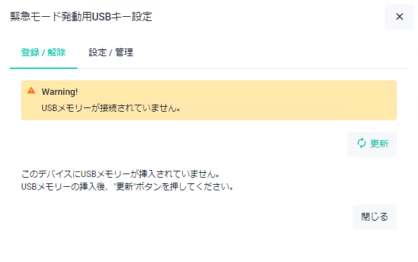 | USBキー挿入による緊急モード稼働スイッチ | USBを挿入後にスイッチを「有効」にします |