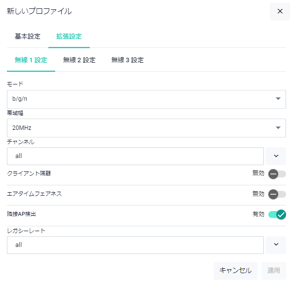 | 無線3 | 対象APプロファイルにおいて、無線3を有効/無効にするか選択します。またVAPで使用するSSIDを選択します |
