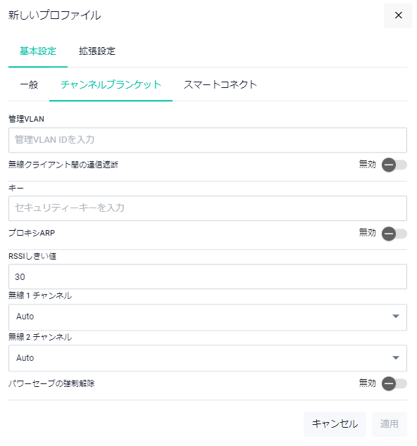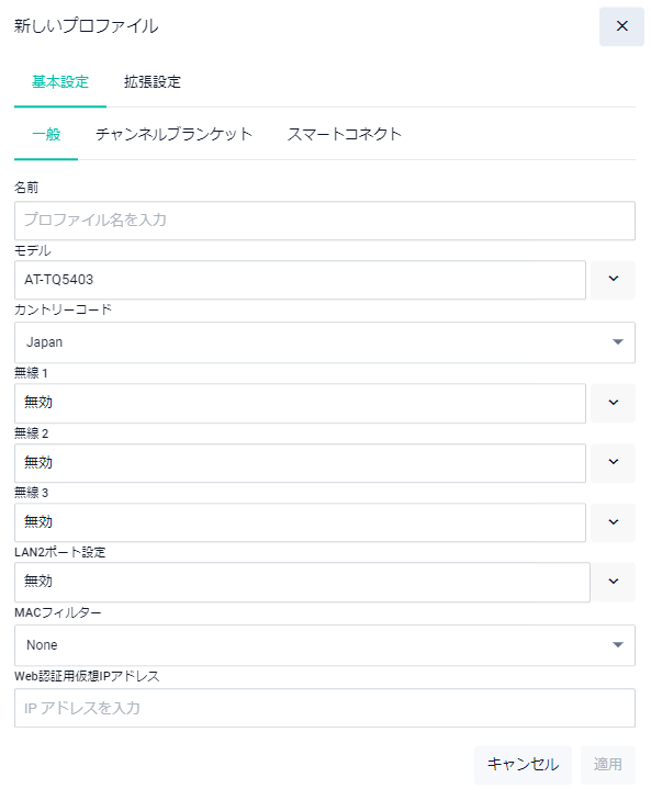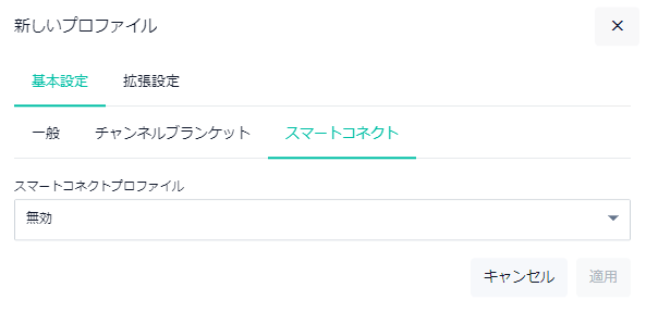 Note「新しいプロファイル - 基本設定」ダイアログでは、一般、チャンネルブランケット、スマートコネクトのタブが選択できます。SNMPエージェント機能の設定はCLIから行ってください。