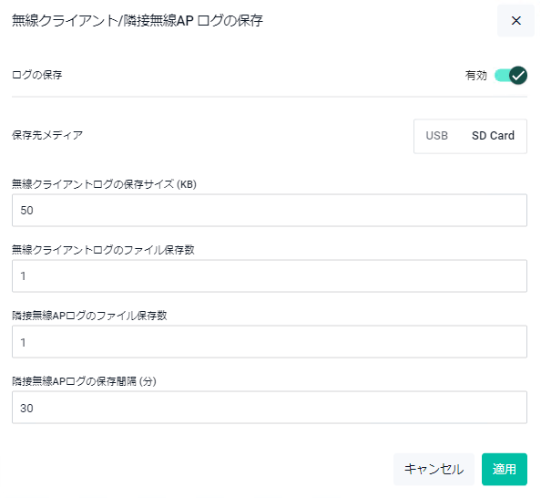 | ログの保存 | 無線クライアント・隣接無線APログ機能の無効・有効を選択します |