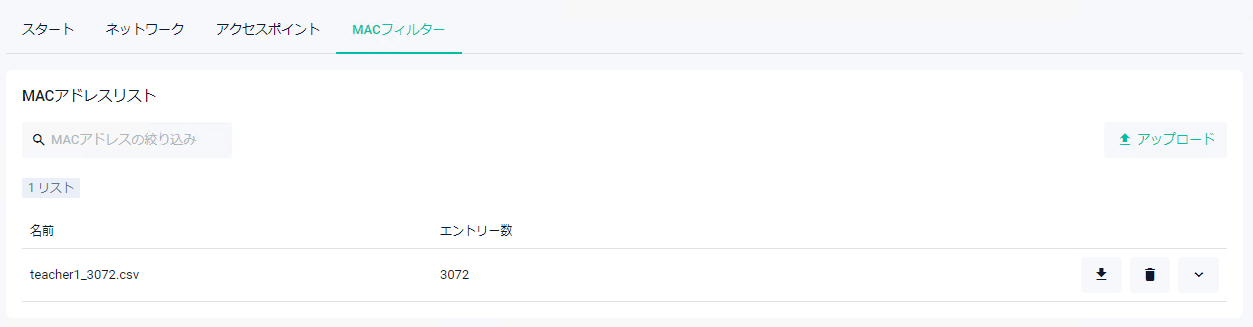 NoteCSVファイルをアップロードするごとにMACフィルターリストが作成されます。また、CSVファイル名がリスト名になります。