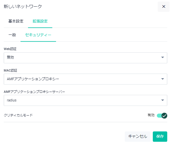 Note各設定項目については「無線LANコントローラー(AWC対応)」/「セキュリティー設定」、「無線LANコントローラー(AWC対応)」/「無線ネットワーク設定」をご覧ください。CLIでは、セキュリティー設定と無線ネットワーク設定は個別に作成し、無線ネットワーク設定の作成時にセキュリティー設定を関連付けますが、Web GUIではネットワーク設定の作成時に「セキュリティー設定」もあわせて行います。