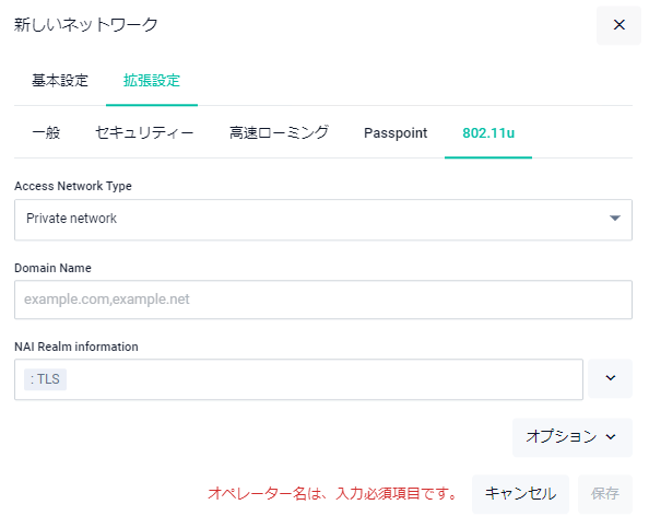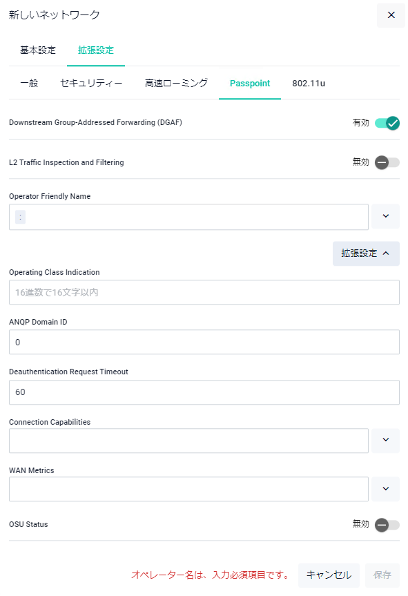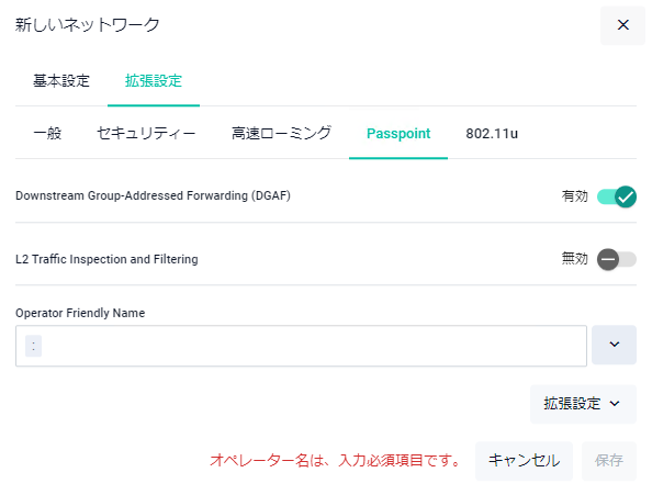 | Passpoint | Passpointの有効/無効を選択します。有効にすると「新しいネットワーク - 拡張設定」ダイアログにPasspointタブ、802.11uタブが表示され、Passpointの設定を行えます |