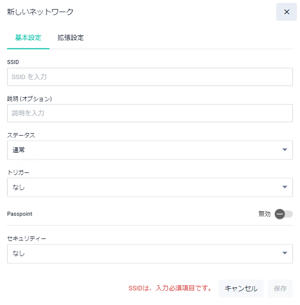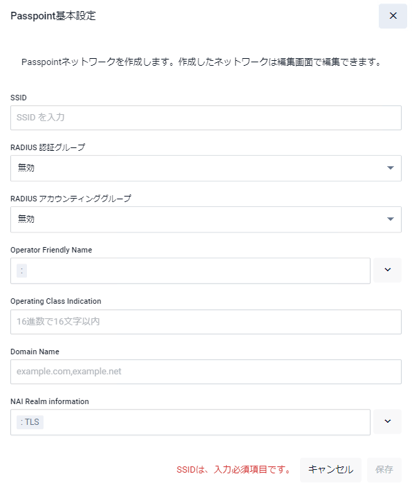 NotePasspointのネットワークを作成するには「ネットワーク追加」ボタンをクリック後に「新しいネットワーク - 基本設定」ダイアログの「Passpoint」を有効にし、「新しいネットワーク - 拡張設定」ダイアログのPasspoint/802.11uタブで行うか、「セットアップ」画面で「Passpoint基本設定」ボタンをクリックします。なお、「Passpoint基本設定」ダイアログでの設定は、Passpointのネットワークを作成する上で最低限必要な設定項目のみとなります。他の設定を行う場合はPasspointのネットワーク作成後に、該当ネットワークの編集ボタンをクリックし「ネットワーク編集 - 拡張設定」ダイアログのPasspoint/802.11uタブで行ってください。