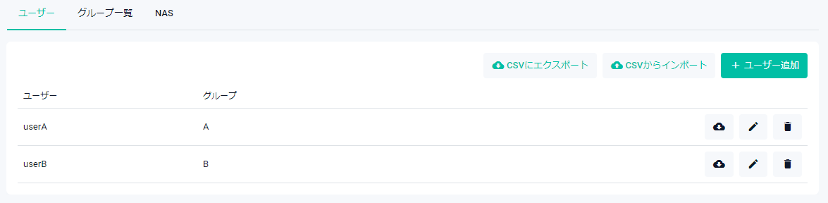 | グループ | 登録済みユーザーの所属しているユーザーグループ名が表示されます |