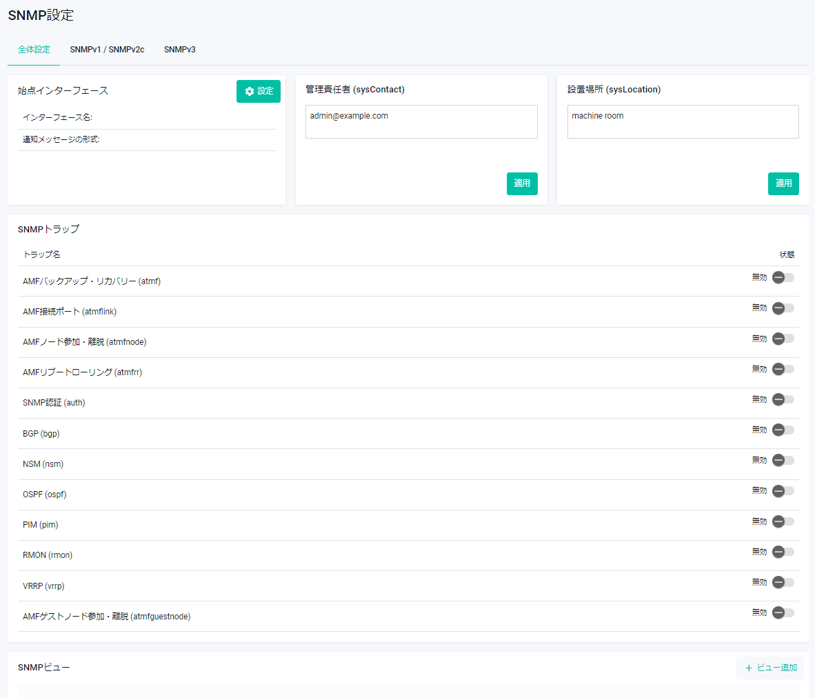 | 適用ボタン | 編集可能な「設置場所 (sysLocation)」欄の値をMIBオブジェクトsysLocationに反映します |