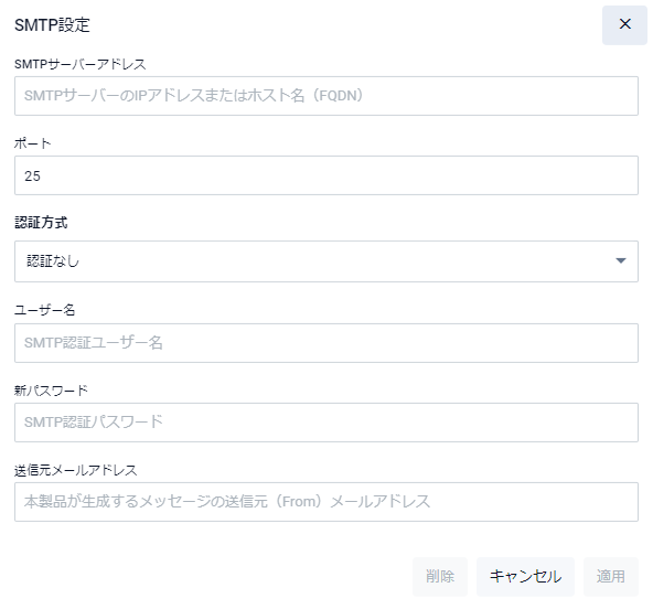 | SMTPサーバーアドレス | 送信用メールサーバー(SMTPサーバー)のIPアドレスまたはホスト名を入力してください |