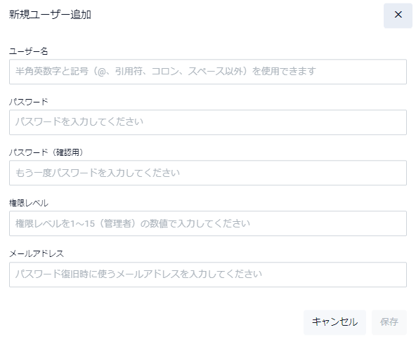 | 権限レベル | 新規ユーザーの権限レベルを入力してください |