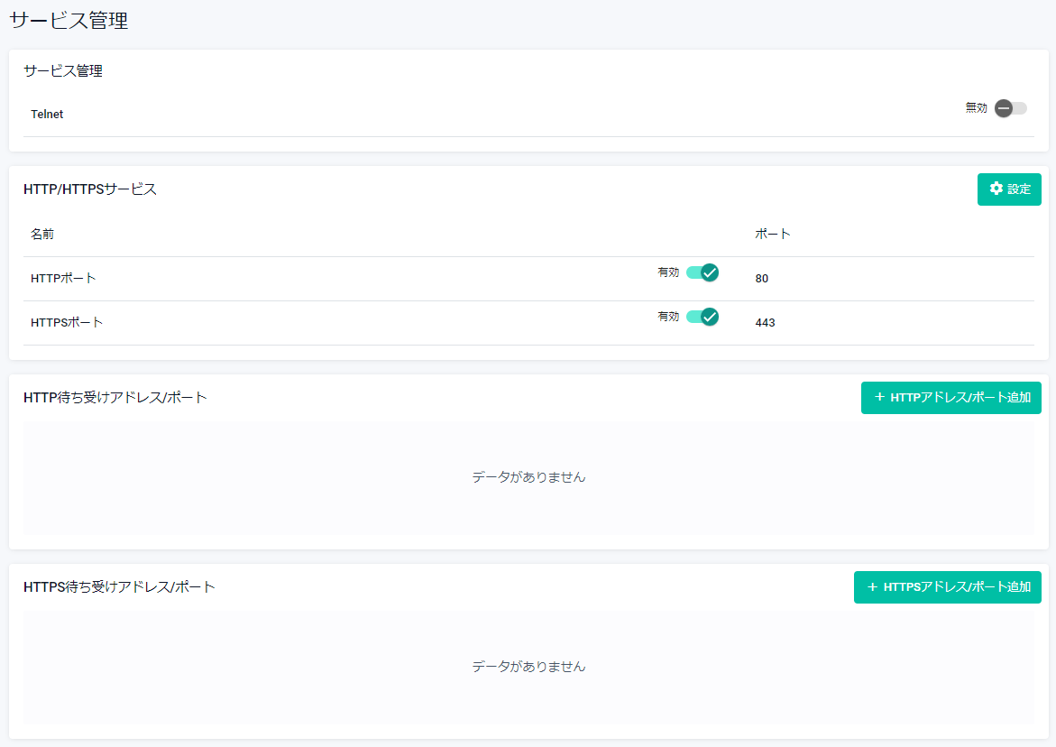 | HTTPポート | スライドボタンでHTTPポートの有効・無効を切り替えます。ポート欄にはHTTPポートの現在の設定が表示されます |
