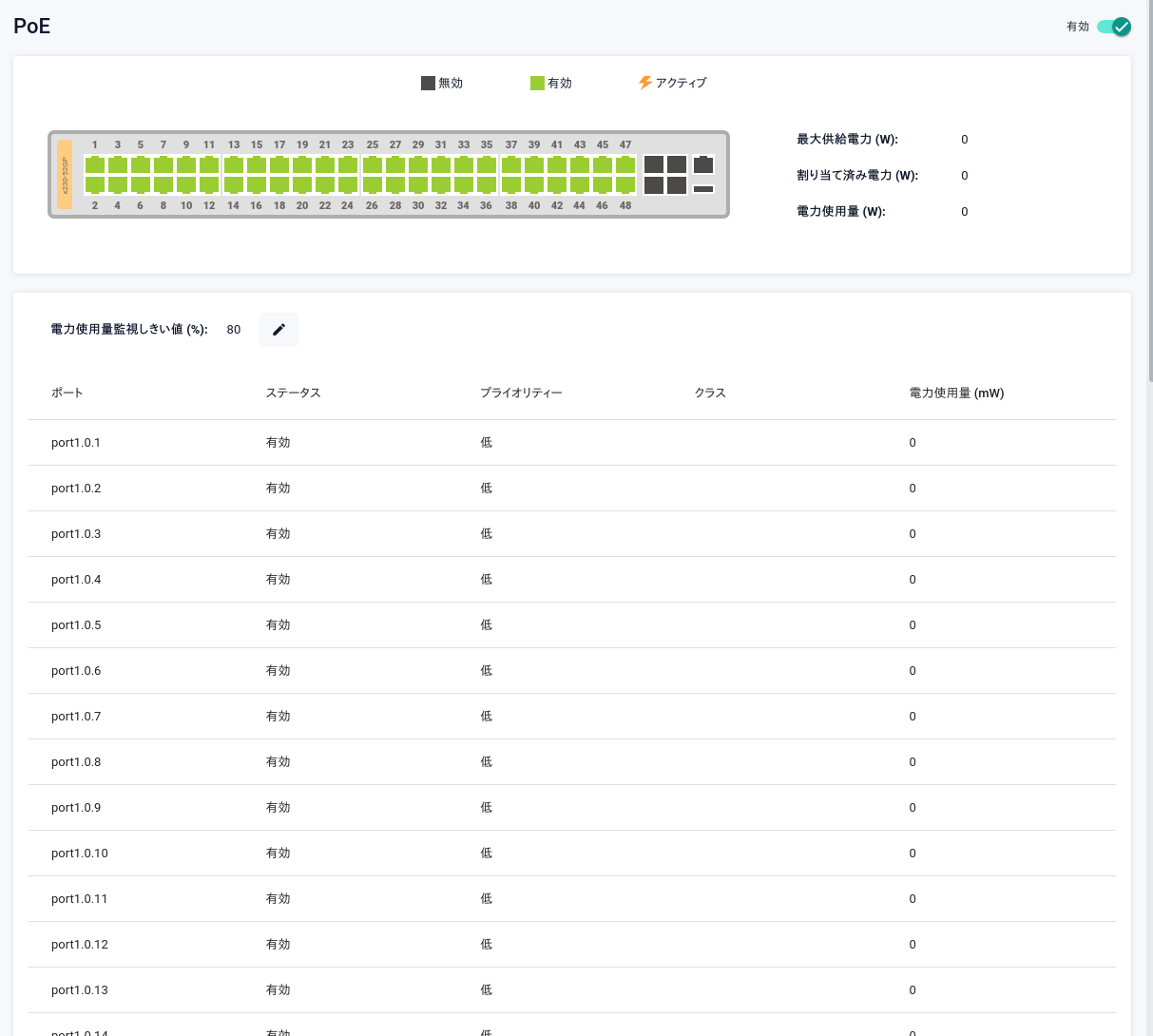 | 無効・有効スライドボタン | システム全体でPoE給電機能の無効・有効を切り替えます |