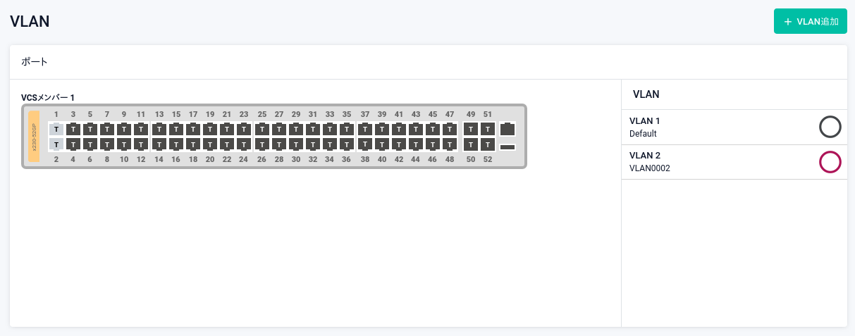 | ポート | 各スイッチポートのタグ設定と所属VLANが視覚的に表示されます。 ・無色U - 初期設定ポート(明示的なVLAN設定のない、vlan1所属のタグなしポート) ・U - タグなしポート(アクセスポート) ・T - タグ付きポート(トランクポート) 各ポートの所属VLANは、該当ポートにマウスカーソルを当てると表示されるポップアップによって確認できます。 また、タグなしポートでは所属VLANが「VLAN」一覧の色でも示されます。 一方タグ付きポートは、「VLAN」一覧で選択中のVLANに所属していれば背景色が該当VLANの色になり、そうでなければ背景色が濃い灰色になります。 ポートをクリックまたはマウスカーソルを当てることで該当ポートのタグ設定と所属VLANの変更およびネイティブVLANの設定をすることもできます。詳細は「タグ設定・所属VLANの変更・ネイティブVLANの設定」をご覧ください |