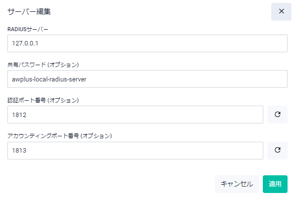 | RADIUSサーバー | RADIUSサーバーのIPアドレスまたはホスト名を入力してください |