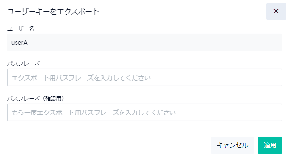 | エクスポートボタン | 登録済みユーザーのユーザー証明書と秘密鍵をPKCS#12形式のファイルとしてエクスポートするためのユーザーキーをエクスポートダイアログが開きます |