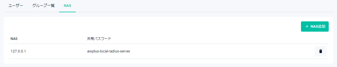 | 共有パスワード | 登録済みNAS・RADIUSサーバー間の通信に使用する共有パスワードが表示されます |