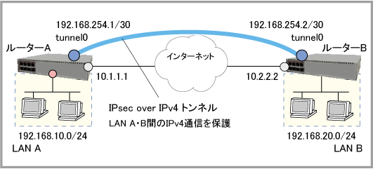 なお、前提事項として、ルーターA・BはIPv4でインターネットに接続しているものとします。WAN側インターフェースのIPアドレスは固定であり、ルーター間でのIP通信もできているものとします。