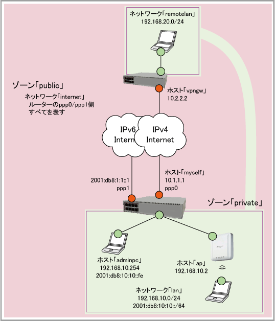 awplus(config)# zone public ↓ awplus(config-zone)# network internet ↓ awplus(config-network)# ip subnet 0.0.0.0/0 interface ppp0 ↓ awplus(config-network)# ipv6 subnet ::/0 interface ppp1 ↓ awplus(config-network)# host myself ↓ awplus(config-host)# ip address 10.1.1.1 ↓ awplus(config-host)# exit ↓ awplus(config-network)# host vpngw ↓ awplus(config-host)# ip address 10.2.2.2 ↓ awplus(config-host)# exit ↓ awplus(config-network)# exit ↓ awplus(config-zone)# exit ↓
