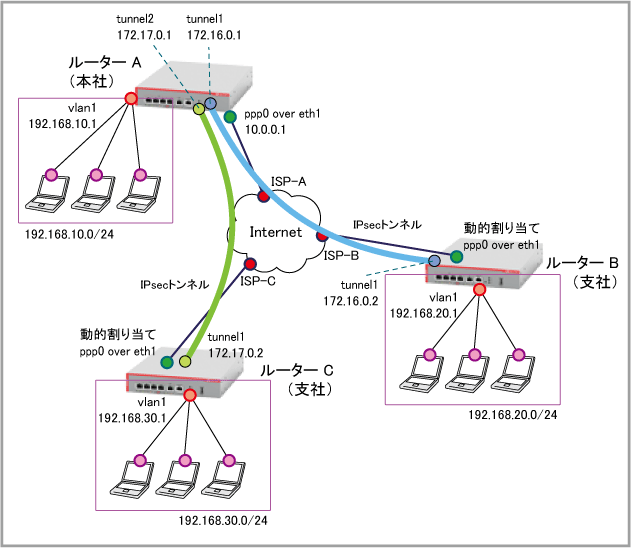 | LAN側(vlan1)IPアドレス | 192.168.10.1/24 | 192.168.20.1/24 | 192.168.30.1/24 |