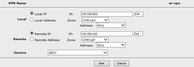 まず、LAN→IPsecトンネル方向の設定を行うため、以下のようにFrom/ToのZoneを選択して[New]をクリックします。