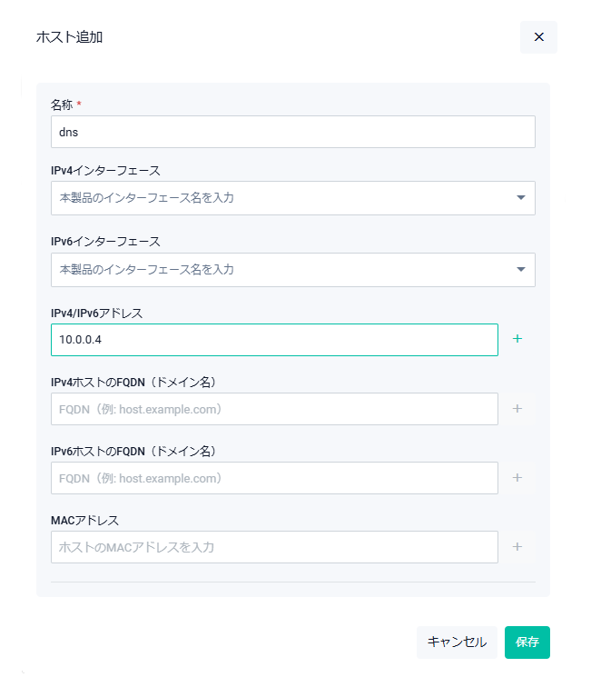 | IPv4ホストのFQDN(ドメイン名) | IPv4ホストをFQDN(ドメイン名)で登録したい場合に指定します |