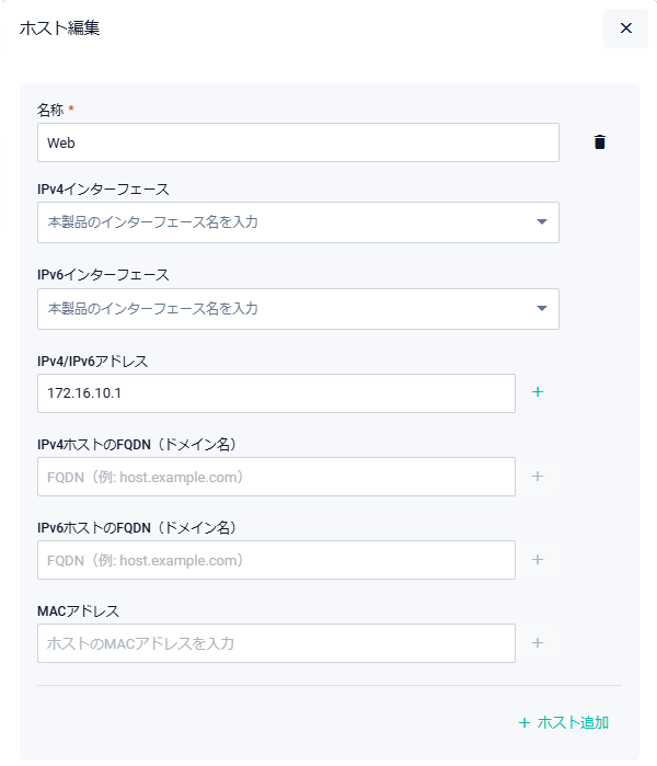 | 名称 | 定義済みホストの場合は該当ホストの名前が表示されます。 また「ホスト追加」で追加した入力欄には、追加するホストの名前を入力してください。64文字以内。半角英数字とハイフン(-)、アンダースコア(_)を使用可能です |