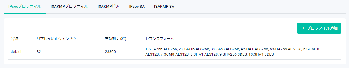 | 削除ボタン | IPsecプロファイルを削除します。削除前には確認のダイアログが表示されます。 ※デフォルトIPsecプロファイル「default」は削除できません |
