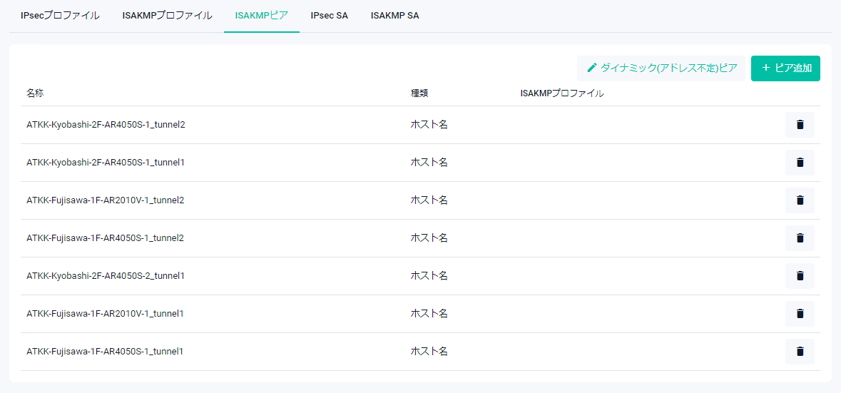 | 削除ボタン | ISAKMPピアとISAKMPプロファイルの関連付けを削除します。削除前には確認のダイアログが表示されます |