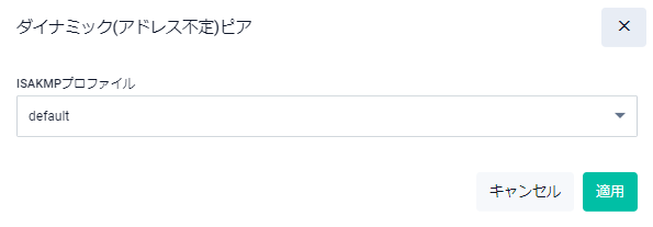 | 適用ボタン | IPアドレスが不定なピアとISAKMPプロファイルの関連付けを行い一覧画面に戻ります |