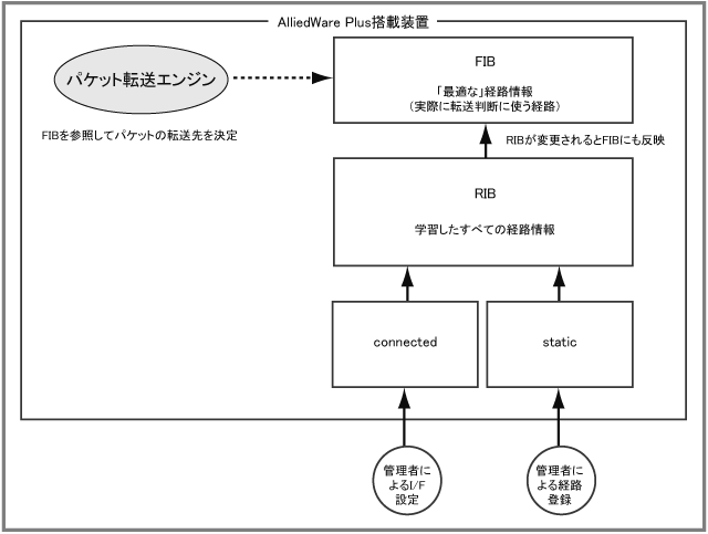 RIB(Routing Information Base:IP経路表)は、各種情報源から得た経路情報を蓄積するデータベースです。RIBには、管理者の手動設定や経路制御プロトコルによって学習された経路が原則としてすべて登録されます。RIBに経路が登録されるのは、次のときです。