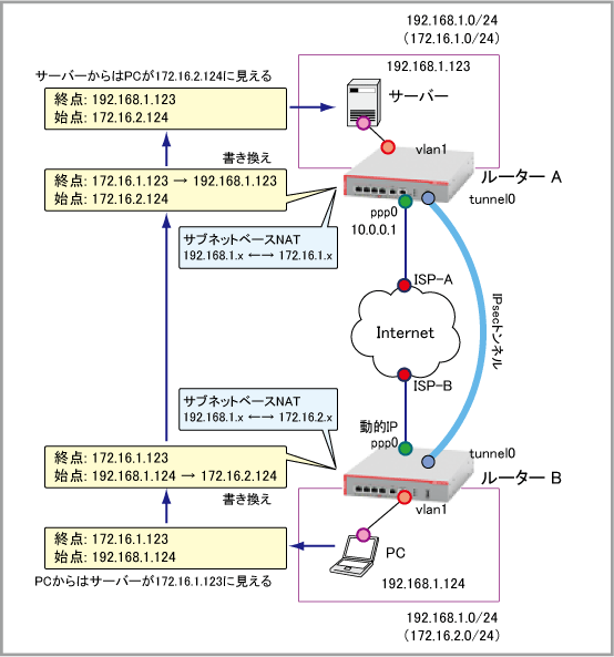 | LAN側(vlan1)内部NAT後IPアドレス | 172.16.1.x/24 | 172.16.2.x/24 |