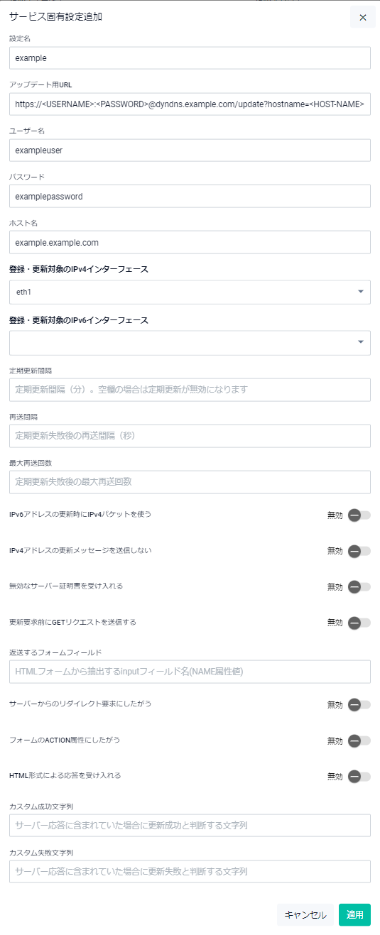 | 定期更新間隔 | 対象DDNSサービスにおける定期更新を有効にする場合、更新間隔(分)を入力してください。空欄の場合は定期更新を行いません |