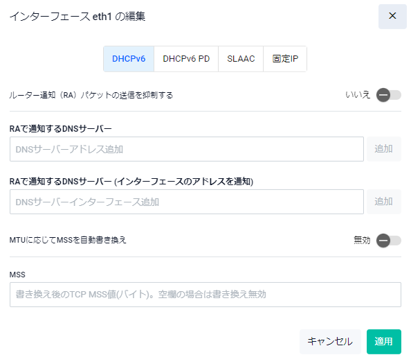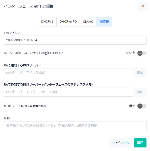 | IPv6アドレス | 対象インターフェースに設定するIPv6アドレスを「2001:db8:10:10::1/64」の形式で入力してください。空欄(未定義)の状態で「適用」ボタンを押した場合は該当インターフェースのIPv6アドレスが削除されます |