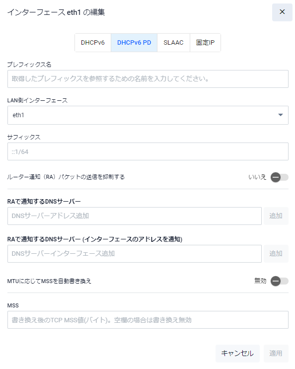 | サフィックス | 取得したプレフィックスと組み合わせるサフィックス(IPv6アドレスの後半部分)とプレフィックス長を「::1/64」の形式で入力してください |