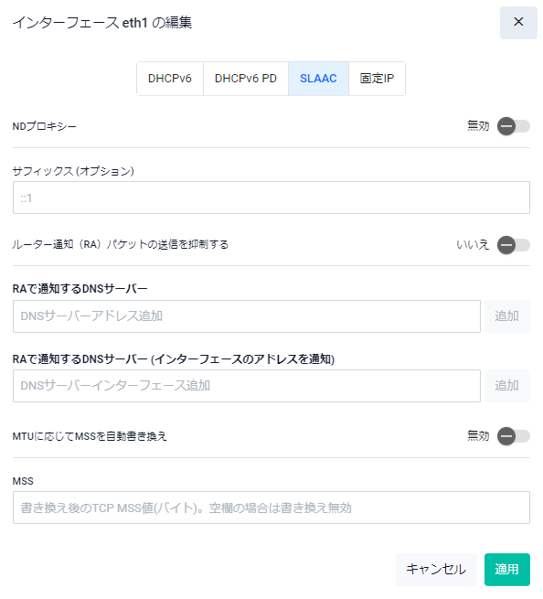 | SLAAC | SLAACによってIPv6アドレスを自動設定する場合はこれを選択してください |