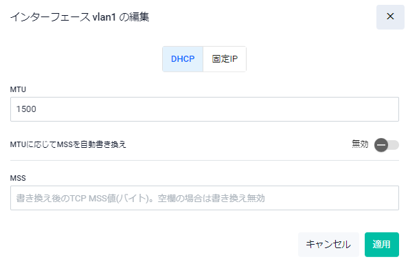 | MTU | 対象インターフェースから送信可能なパケットの最大サイズ(MTU)を入力してください |