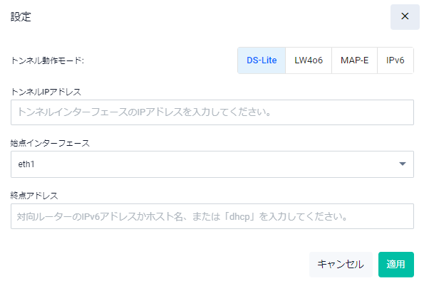 | DHCPインターフェース | AFTRのホスト名をDHCPv6サーバーから取得する場合、DHCPv6またはDHCPv6 PDクライアント機能が動作しているインターフェースを選択してください。本項目は終点アドレスに「dhcp」と入力したときだけ表示されます |