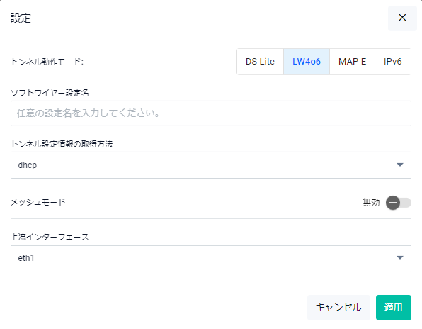 | トンネル設定情報の取得方法 | dhcp(DHCPv6サーバーから取得)を選択してください。LW4o6では他の方式はサポート対象外です |