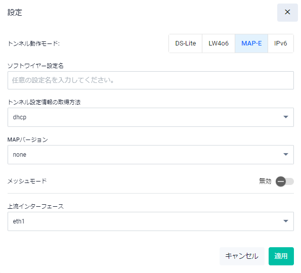| 上流インターフェース | MAPルール配信サーバーとの通信や本製品・事業者側ルーター(BR)間のIPv4 over IPv6トンネル構築に用いる本製品側のIPv6インターフェースを指定してください。 MAPルール配信サーバーやBRとの通信にはグローバルなIPv6アドレスを用いるため、上流インターフェースはグローバルIPv6アドレスを持つ必要があります。また、設定取得方式がdhcpの場合は、DHCPv6またはDHCPv6 PDクライアント機能を動作させている必要があります |